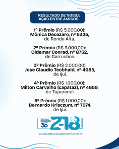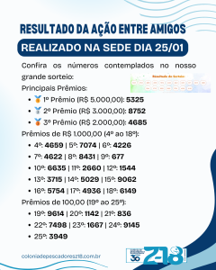 SORTEIO REALIZADO! 🏆🎣É com grande alegria que compartilhamos os números contemplados na nossa Ação Entre Amigos da Colônia Z18!